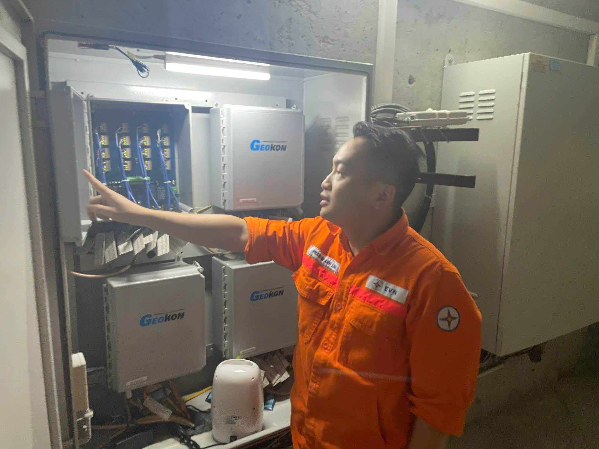 Kỹ sư Phạm Khánh Linh kiểm tra trạng thái hệ thống quan trắc tự động tại công trình Thủy điện Lai Châu