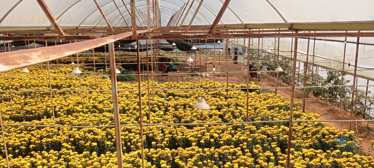 Sử dụng đèn Led chong đèn cho hoa cúc tại huyện Lạc Dương, tỉnh Lâm Đồng. Ảnh: PC Lâm Đồng