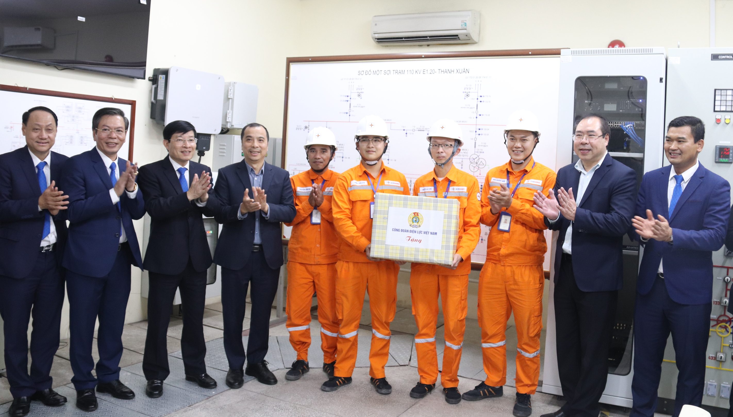 Phó Tổng giám đốc EVN Ngô Sơn Hải (thứ tư, từ trái sang) và Chủ tịch Công đoàn Điện lực Việt Nam Đỗ Đức Hùng (thứ hai, từ phải sang) trao quà của Công đoàn Điện lực Việt Nam động viên CBCNV tại Trạm biến áp 110kV Thanh Xuân