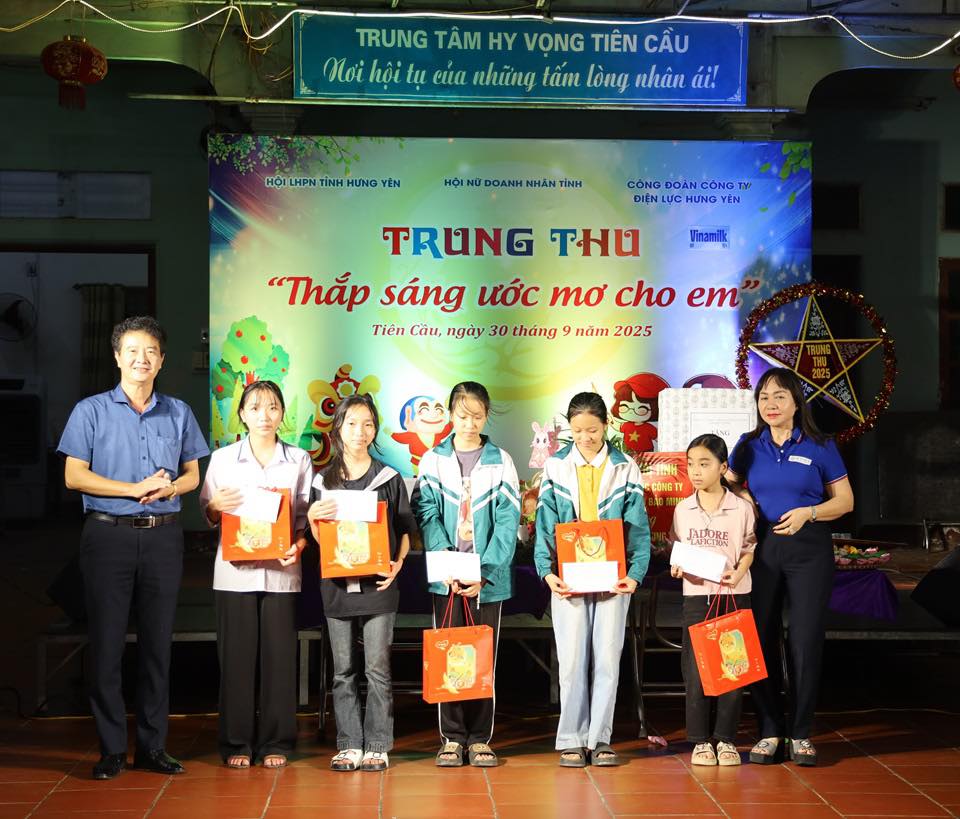 Tại Trung tâm Hy vọng Tiên Cầu (xã Hiệp Cường, tỉnh Hưng Yên) - nơi đang nuôi dưỡng trên 300 trẻ mồ côi, trẻ có hoàn cảnh đặc biệt khó khăn. Công đoàn Công ty Điện lực Hưng Yên phối hợp cùng các đơn vị tổ chức chương trình Trung thu “Thắp sáng ước mơ cho em”, trao quà, học bổng, động viên các em vượt khó vươn lên.