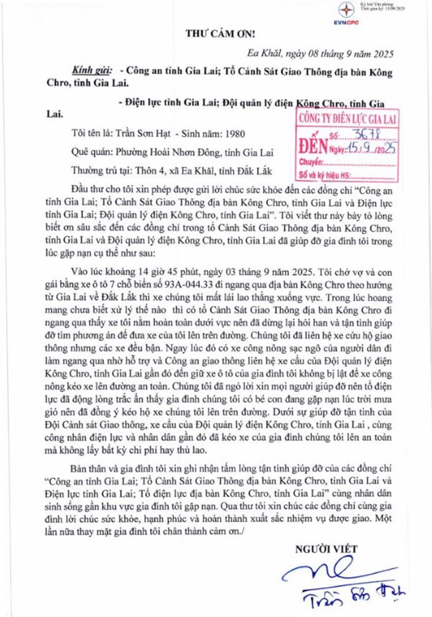 Ngày 15/9/2025, Công ty Điện lực Gia Lai nhận được thư cảm ơn từ ông Trần Sơn Hạt, trú tại xã Ea Khal, tỉnh Đắk Lắk. Trong thư, ông bày tỏ lòng biết ơn sâu sắc đến tập thể Đội Quản lý điện Kông Chro và lực lượng Cảnh sát Giao thông Kông Chro vì đã kịp thời hỗ trợ gia đình ông trong một vụ tai nạn giao thông xảy ra đầu tháng 9.