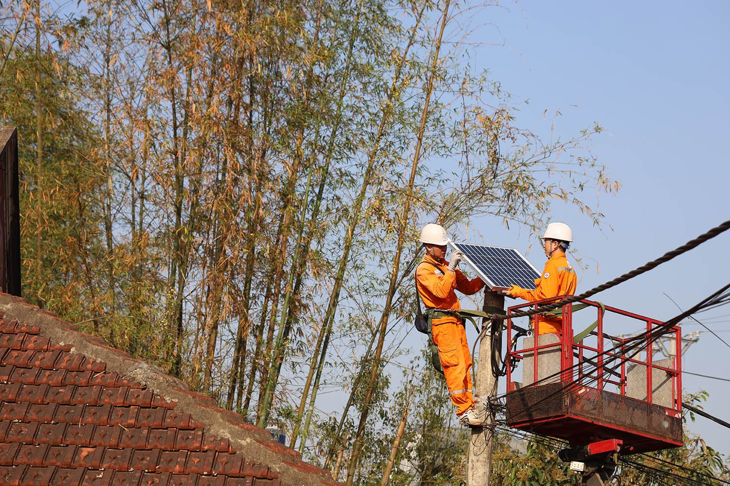 Đoàn viên thanh niên Điện lực thành phố Điện Biên Phủ lắp đặt hệ thống chiếu sáng tại bản Co Cáng. Ảnh: Thu Huyền