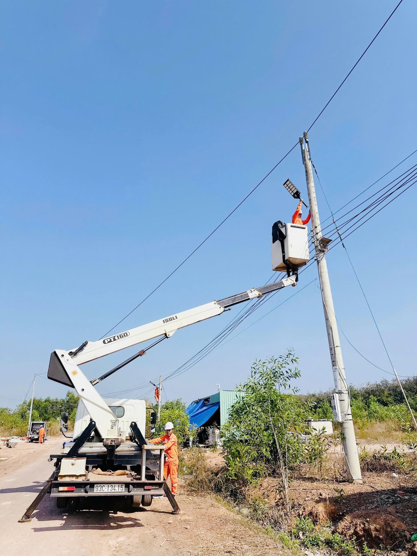 Nhân viên Đội Quản lý điện Đồng Phú thi công lắp đặt công trình
