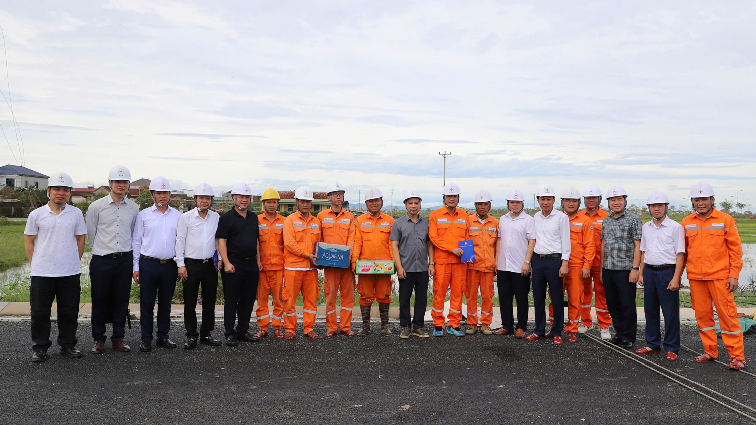 Lãnh đạo Tập đoàn, Tổng công ty Điện lực miền Bắc cùng đoàn công tác động viên đội ngũ công nhân đang trực tiếp tham gia khắc phục sự cố tại xã Thạch Hà