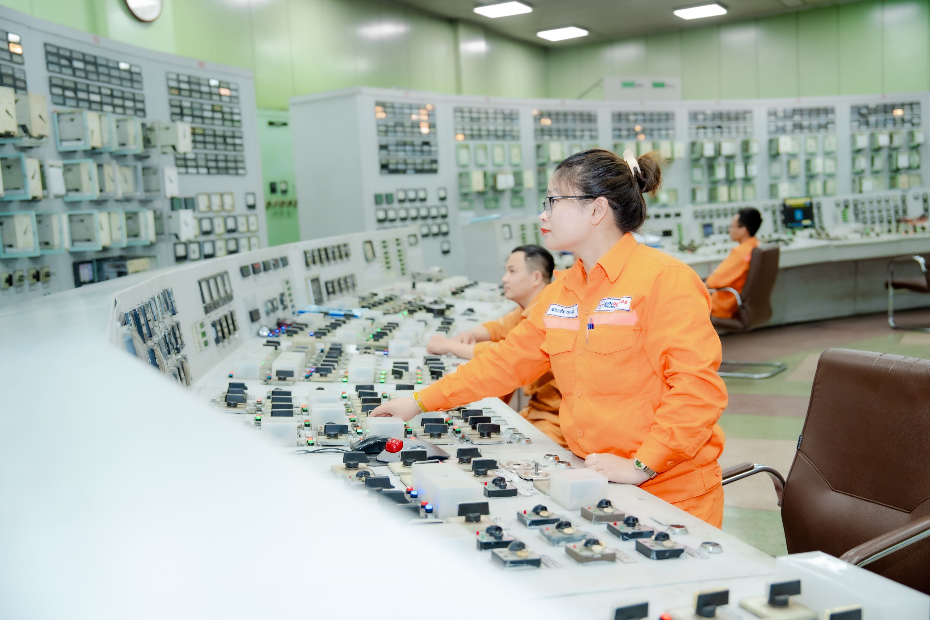 Nữ CBCNV làm việc tại phòng điều khiển, vận hành thiết bị, đóng góp trực tiếp vào quá trình sản xuất điện ổn định, liên tục.