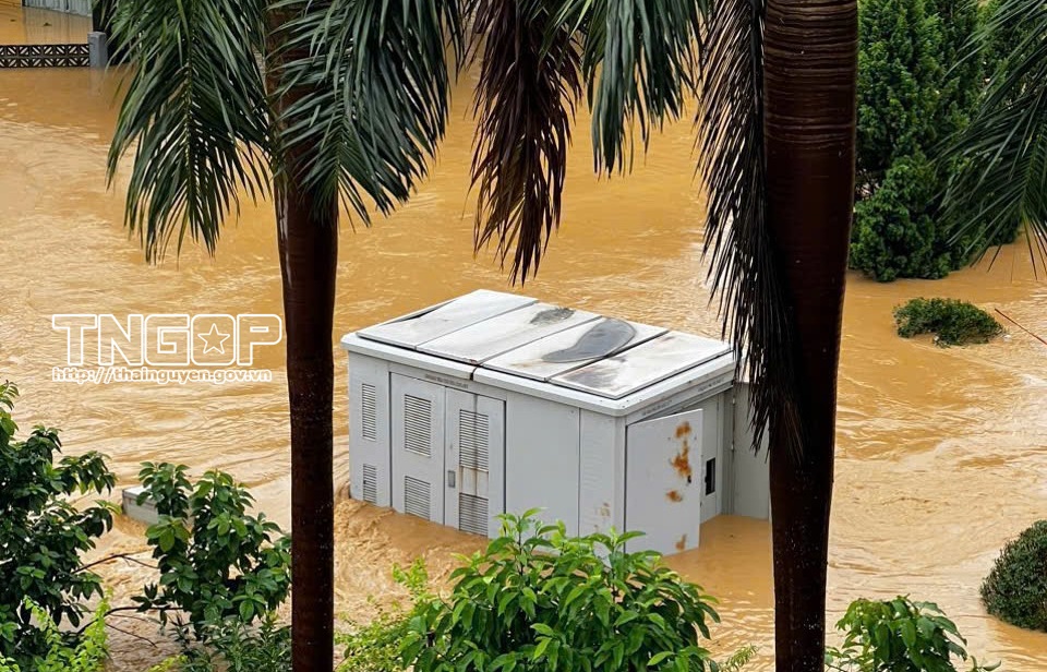 Một trạm biến áp bị ngập trong nước lũ. Nguồn ảnh: Báo Thái Nguyên