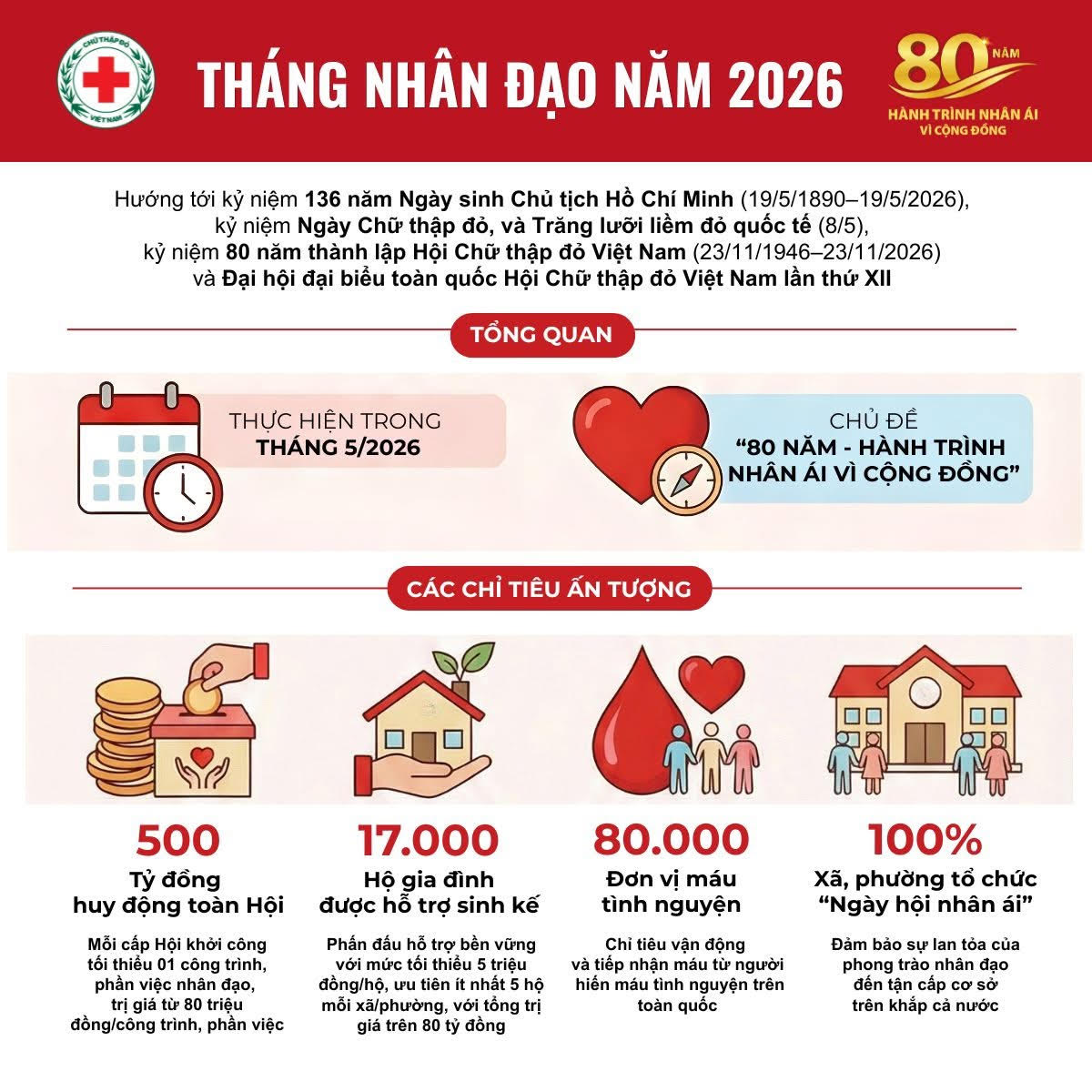 Tháng Nhân đạo năm 2026 mang ý nghĩa đặc biệt khi gắn với năm kỷ niệm 80 năm Ngày thành lập Hội Chữ thập đỏ Việt Nam, kỷ niệm Ngày Chữ thập đỏ và Trăng lưỡi liềm đỏ Quốc tế 08/5.