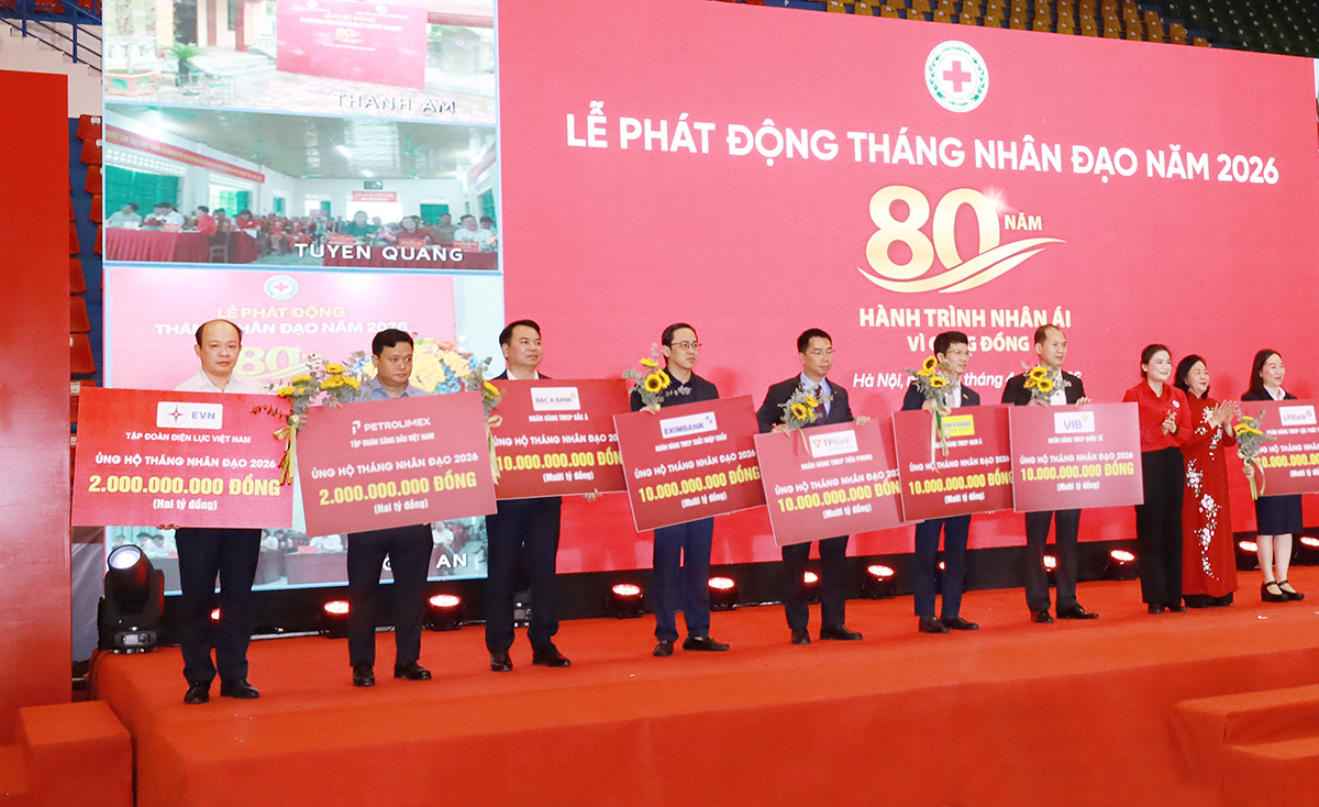 Lễ phát động Tháng Nhân đạo năm 2026 với chủ đề “80 năm - Hành trình nhân ái vì cộng đồng” được tổ chức tại Cung Thể thao Quần Ngựa (Hà Nội), kết nối trực tuyến tới 34 tỉnh, thành phố, trực tiếp tới 4 điểm cầu tại xã Vân Đình (Hà Nội), xã Thượng Nông (Tuyên Quang), xã Tương Dương (Nghệ An), xã An Cư (An Giang).