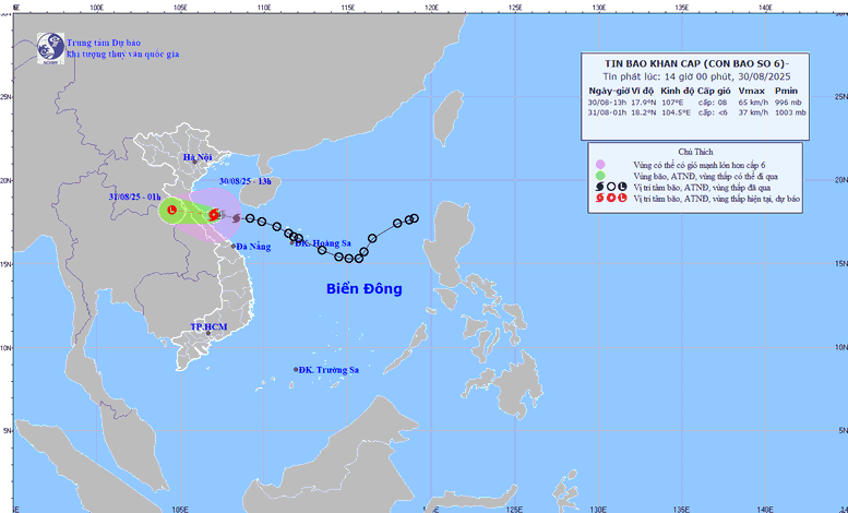 Theo dự báo của Trung tâm dự báo khí tượng thủy văn quốc gia chiều tối nay (ngày 30 tháng 8) bão số 6 sẽ đi vào đất liền các tỉnh Hà Tĩnh - Bắc Quảng Trị, đây là những khu vực đã chịu tác động bão, mưa lũ do ảnh hưởng của bão số 5; các tỉnh từ Thanh Hoá đến thành phố Huế có mưa to đến rất to; nguy cơ rất cao xảy ra lũ ống, lũ quét, sạt lở đất ở vùng núi và ngập lụt tại vùng thấp trũng, ven sông, khu đô thị. Đây là cơn bão di chuyển nhanh, đổ bộ vào thời gian nghỉ cuối tuần và đang diễn ra các hoạt động chuẩn bị cho Đại lễ Quốc khánh 02/9.