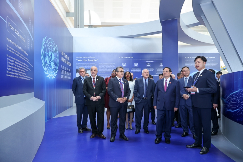 Thủ tướng tham quan không gian trưng bày thành tựu phát triển của Liên Hợp Quốc - Ảnh: VGP/Nhật Bắc