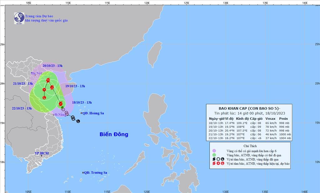 Trong 48 đến 72 giờ tiếp theo, bão di chuyển theo hướng Tây, mỗi giờ đi được khoảng 10-15km và có khả năng mạnh thêm. Đến 07 giờ ngày 23/10, vị trí tâm bão ở khoảng 16,7 độ Vĩ Bắc; 113,0 độ Kinh Đông, ngay trên khu vực quần đảo Hoàng Sa. Sức gió mạnh nhất vùng gần tâm bão mạnh cấp 11 (100-115km/giờ), giật cấp 14.