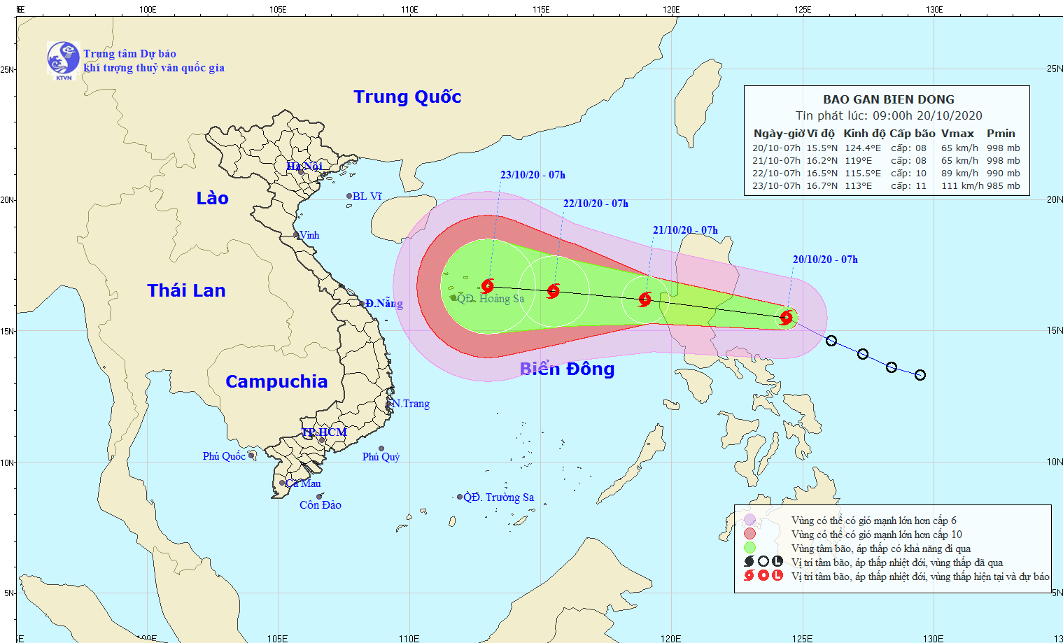 Dự báo trong 24 giờ tới, bão di chuyển theo hướng Tây Tây Bắc, mỗi giờ đi được 20-25km, đi vào Biển Đông. Đến 07 giờ ngày 21/10, vị trí tâm bão ở khoảng 16,2 độ Vĩ Bắc; 119,0 độ Kinh Đông, cách quần đảo Hoàng Sa khoảng 740km về phía Đông Đông Nam. Sức gió mạnh nhất vùng gần tâm bão mạnh cấp 8 (60-75km/giờ), giật cấp 10.