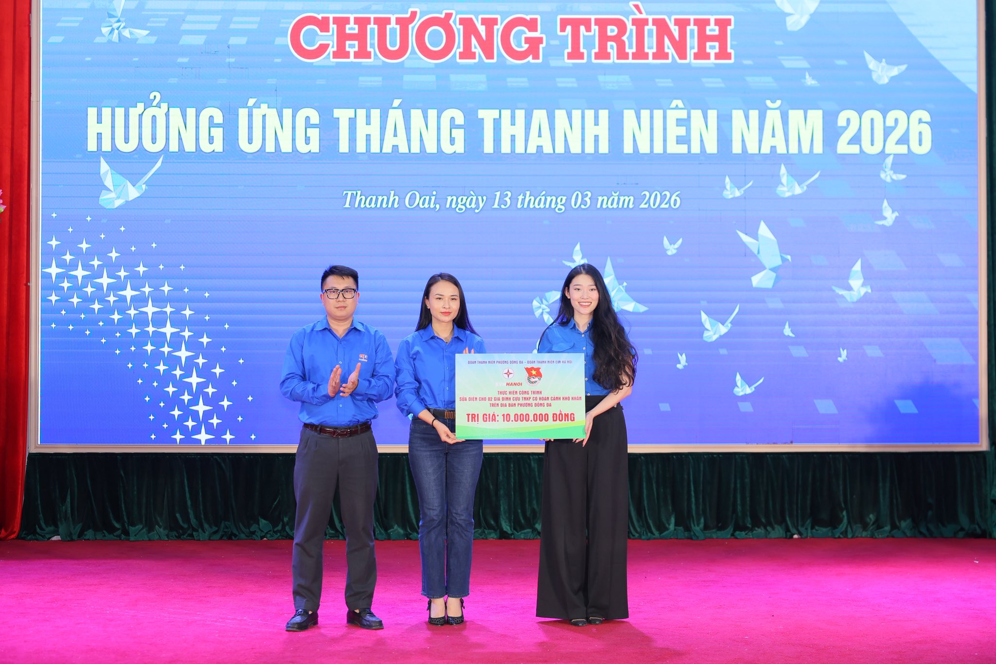 Cũng trong dịp này, Đoàn Thanh niên EVNHANOI đã trao biển tượng trưng các công trình thanh niên gồm “Sân chơi thiếu nhi” và “Tuyến đường xanh thanh niên” tặng xã Thanh Oai. Bên cạnh đó, trao tặng Đoàn Thanh niên phường Đống Đa công trình sửa chữa điện cho 2 hộ gia đình thanh niên xung phong có hoàn cảnh khó khăn với tổng kinh phí 10 triệu đồng.