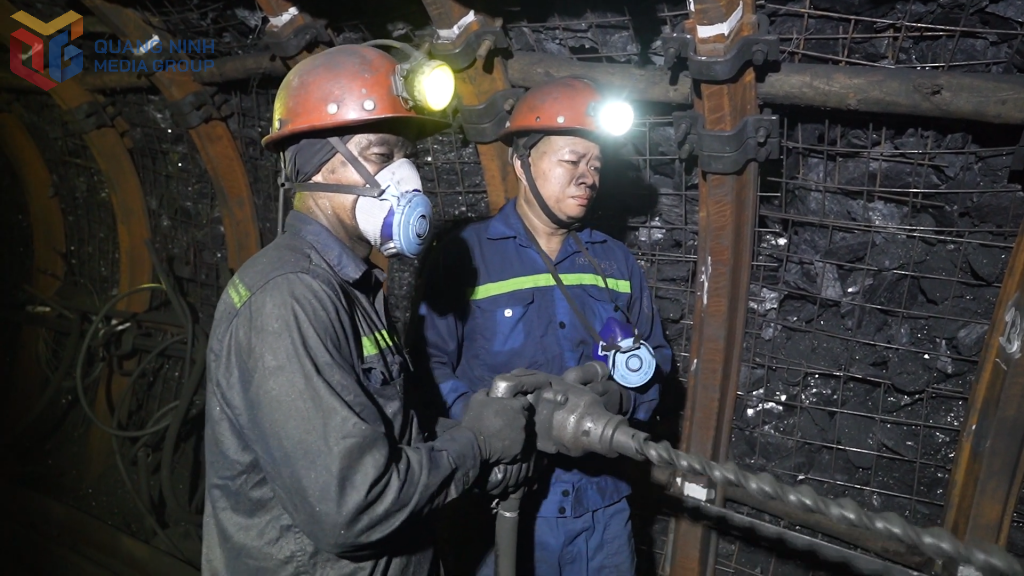 Công nhân Công ty Than Khe Chàm vận hành thiết bị khoan trong ca làm việc dưới hầm lò