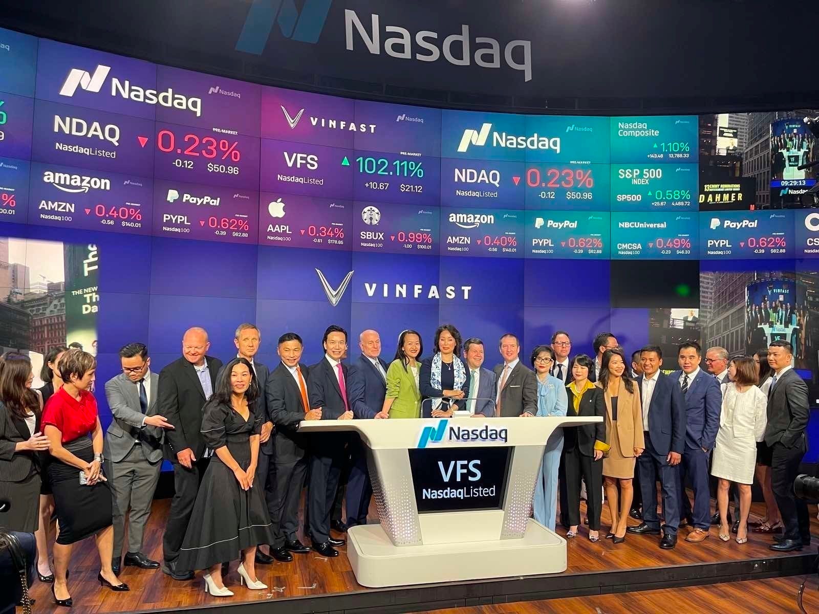 VinFast và đại diện Sàn giao dịch chứng khoán Nasdaq tại Lễ niêm yết cổ phiếu của VinFast- sự kiện ghi dấu ấn về doanh nghiệp Việt vươn ra thế giới. Ảnh minh họa