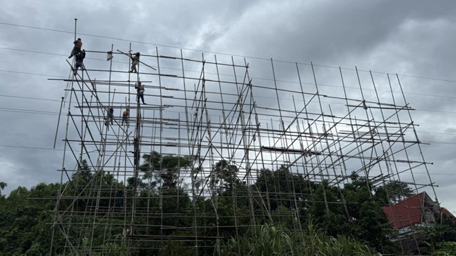 Công nhân lắp giàn giáo kéo dây vượt Quốc lộ 4E, địa phận tỉnh Lào Cai. Ảnh: Bảo Nguyên