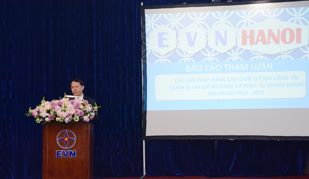 Ông Nguyễn Quang Trung - Phó Tổng giám đốc EVNHANOI trình bày tham luận Hành trình thay đổi hình thức thu thập xác nhận chỉ số công tơ