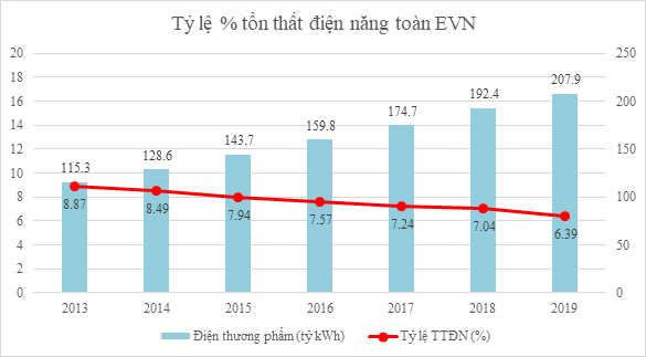 Tỷ lệ tổn thất điện năng (TTĐN) toàn EVN đã giảm từ 8,87% (năm 2013) xuống 6,39% (năm 2019). Đây là mức tổn thất đạt ngang bằng với một số nước tiên tiến trên thế giới.