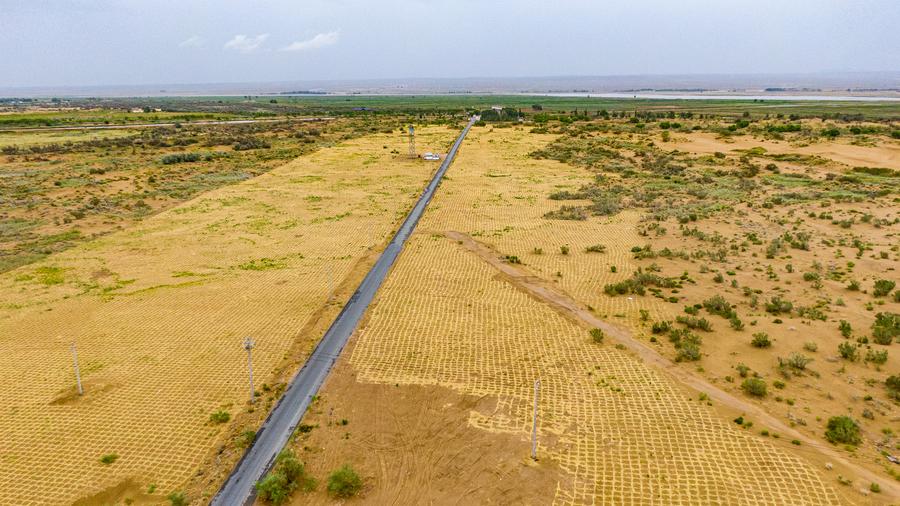 Bức ảnh chụp từ trên cao vào ngày 18/6/2023 cho thấy các ô rơm được sắp xếp theo hình bàn cờ, một phương pháp được địa phương sử dụng để ngăn chặn cát bay, tại sa mạc Ulan Buh ở huyện Đăng Khẩu, thành phố Bayannur, khu tự trị Nội Mông, miền Bắc Trung Quốc