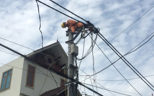 Công nhân điện kéo dây tăng cường đường trục đảm bảo cấp điện an toàn, liên tục phục vụ khách hàng