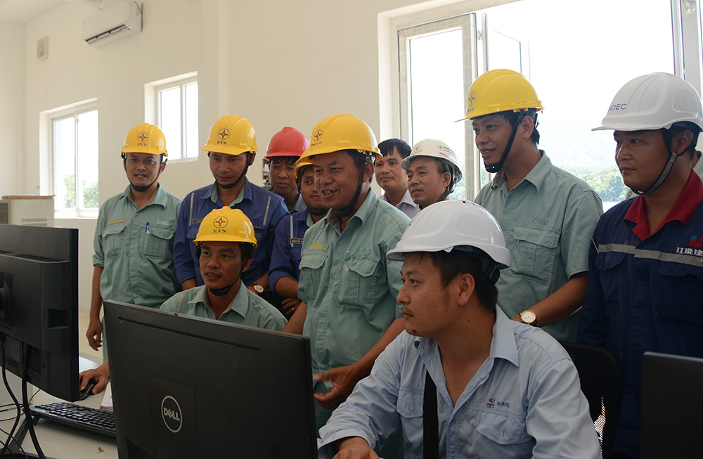 Các kỹ sư, công nhân của DHD và các nhà thầu chuẩn bị cho thời điểm đóng điện dự án Nhà máy Điện mặt trời nổi hồ Đa Mi