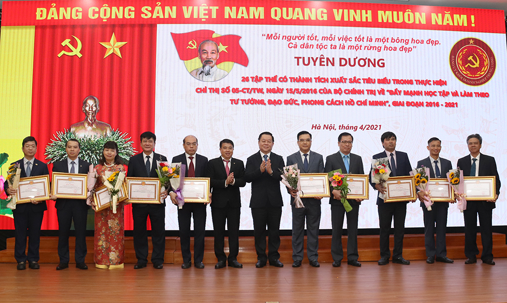 Đại diện Đảng bộ Trung tâm Điều độ Hệ thống điện miền Trung (thứ 3 từ phải sang) nhận Bằng khen của Đảng ủy Khối DNTW vì đạt thành tích xuất sắc tiêu biểu trong thực hiện Chỉ thị 05-CT/TW của Bộ Chính trị về “Đẩy mạnh học tập và làm theo tư tưởng, đạo đức, phong cách Hồ Chí Minh” giai đoạn 2016-2020. Ảnh: Huyền Thương
