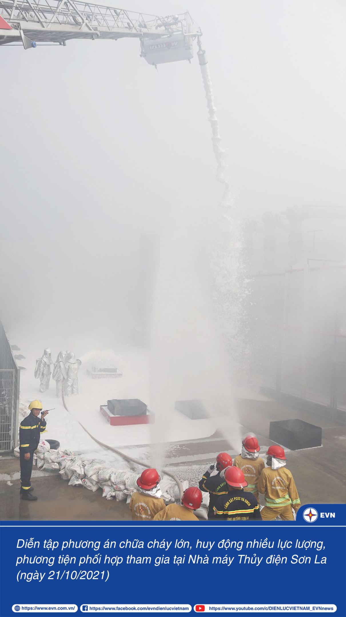 Tình huống giả định có 2 đám cháy quy mô lớn, phức tạp. Cụ thể, lúc 9h ngày 21/10, xảy ra vụ cháy tại trạm dầu điều tốc tổ máy 1. Đám cháy xảy ra khu vực kín, nhiều thiết bị và nhất là gần các bình tích năng của hệ thống điều tốc. Nhiệt bức xạ gây mất an toàn cho các bình tích năng, khói sinh ra từ đám cháy với nồng độ dày đặc lan tỏa khắp khu vực, trong khi 3 công nhân đang làm việc ở khu vực cháy chưa thoát ra được. Sau đó, đến 9h30 phút tại máy biến áp T4 của nhà máy lại xảy ra sự cố cháy lớn; lửa và khói đen dày đặc bao trùm toàn bộ máy biến áp, hệ thống chữa cháy phun sương tự động không hoạt động. Nhiệt độ của đám cháy tác động mạnh ra môi trường xung quanh nguy cơ lớn dẫn đến cháy lan sang máy biến áp T5. Các sự cố cháy sẽ làm cho các tổ máy dừng hoạt động, gây thiếu hụt công suất và gây mất ổn định cho hệ thống điện quốc gia, có thể dẫn đến rã lưới điện. Việc tổ chức chữa cháy không kịp thời sẽ dẫn đến cháy lan, cháy lớn gây thiệt hại nghiêm trọng về tài sản, ảnh hưởng đến môi trường và tình hình an ninh trật tư xã hội trên địa bàn.