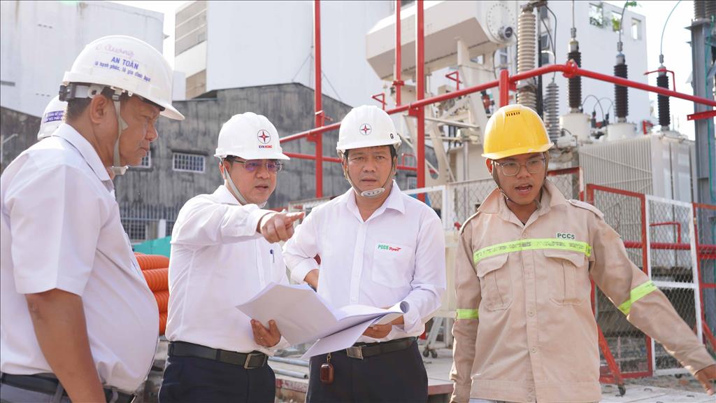 Trong ảnh: Đơn vị thi công báo cáo đoàn công tác EVN về tiến độ triển khai hạng mục nhà máy chính.