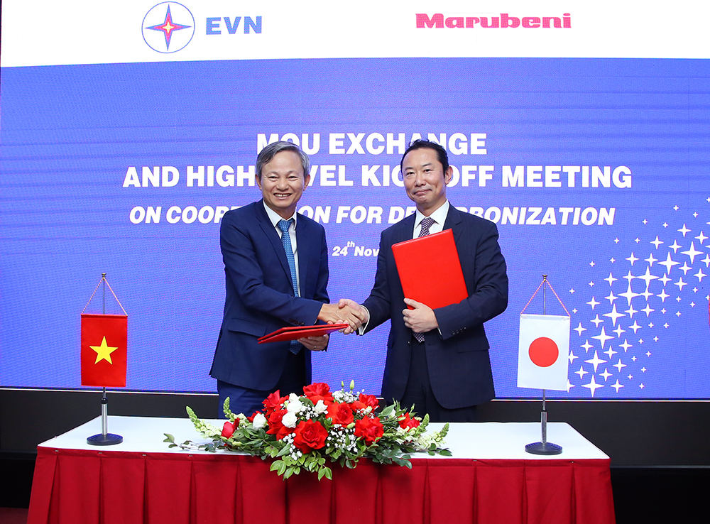 Biên bản ghi nhớ hợp tác (MOU) giữa EVN và Marubeni hướng tới mục tiêu giảm phát thải carbon đã được thông qua từ tháng 9/2022. Tiếp đó, hai tập đoàn triển khai ký kết MOU theo hình thức đại diện lãnh đạo các bên ký luân phiên. Biên bản đã được lãnh đạo cấp cao của hai bên trao đổi cho nhau tại cuộc họp diễn ra chiều nay, ngày 24/11. Marubeni là tập đoàn đầu tiên ký MOU với EVN tập trung vào chủ đề khử carbon.