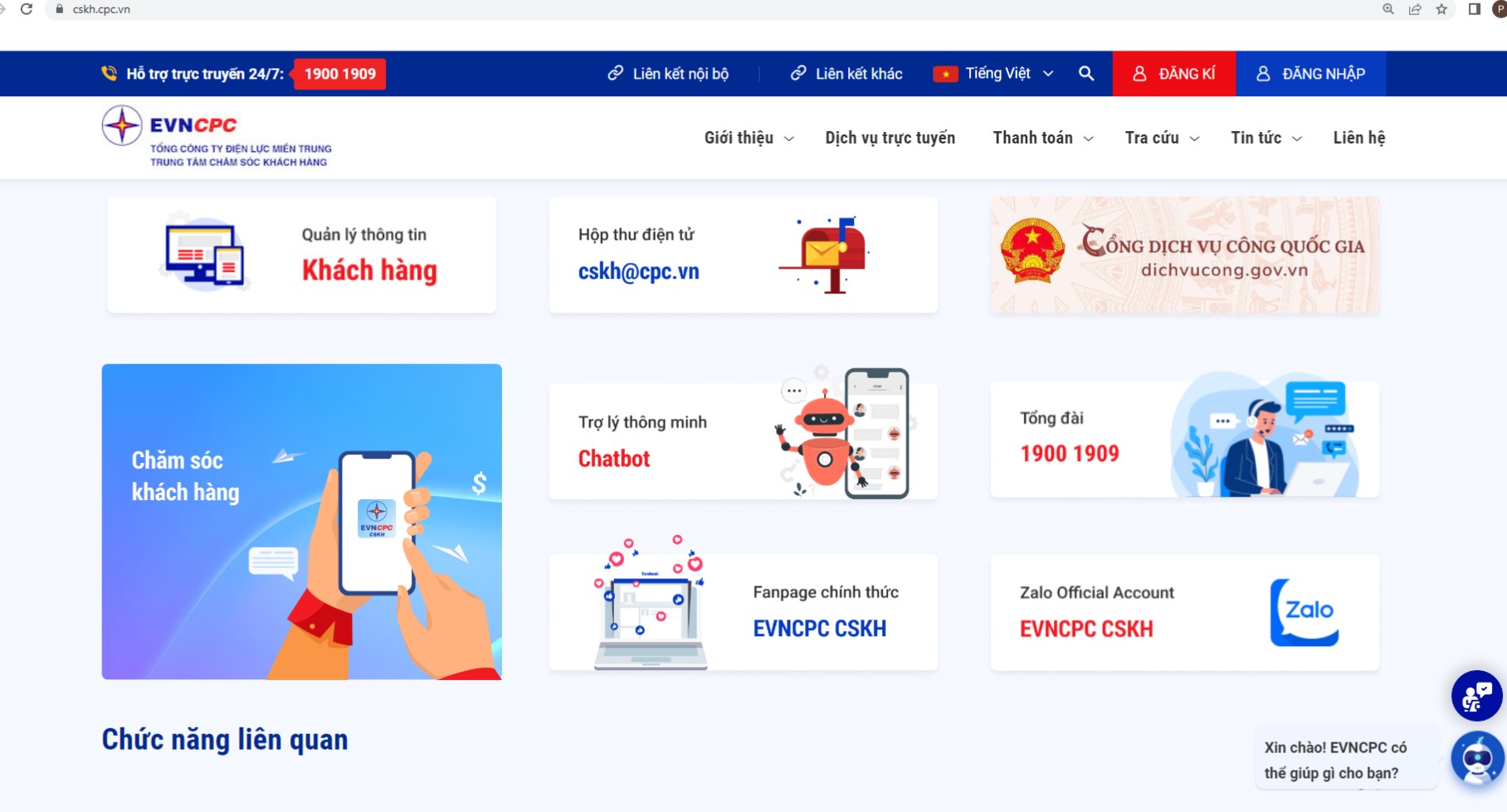 Ngoài ra, còn có các kênh chăm sóc khách hàng của EVNCPC như: website https://cskh.cpc.vn, App EVNCPC CSKH, Cổng Dịch vụ công Quốc gia, Zalo EVNCPC CSKH, Email và Fanpage EVNCPC CSKH. Các kênh này luôn sẵn sàng tiếp nhận, hỗ trợ xử lý, giải đáp bất kỳ vấn đề gì có liên quan đến hoạt động điện lực tại khu vực 13 tỉnh miền Trung – Tây Nguyên.