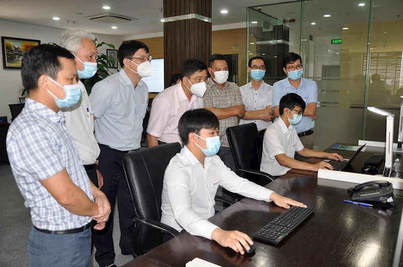 Phó Tổng giám đốc EVN Võ Quang Lâm (đứng, thứ tư từ trái sang) tại Trung tâm Điều độ Hệ thống điện TP Hà Nội, sáng 24/6.
