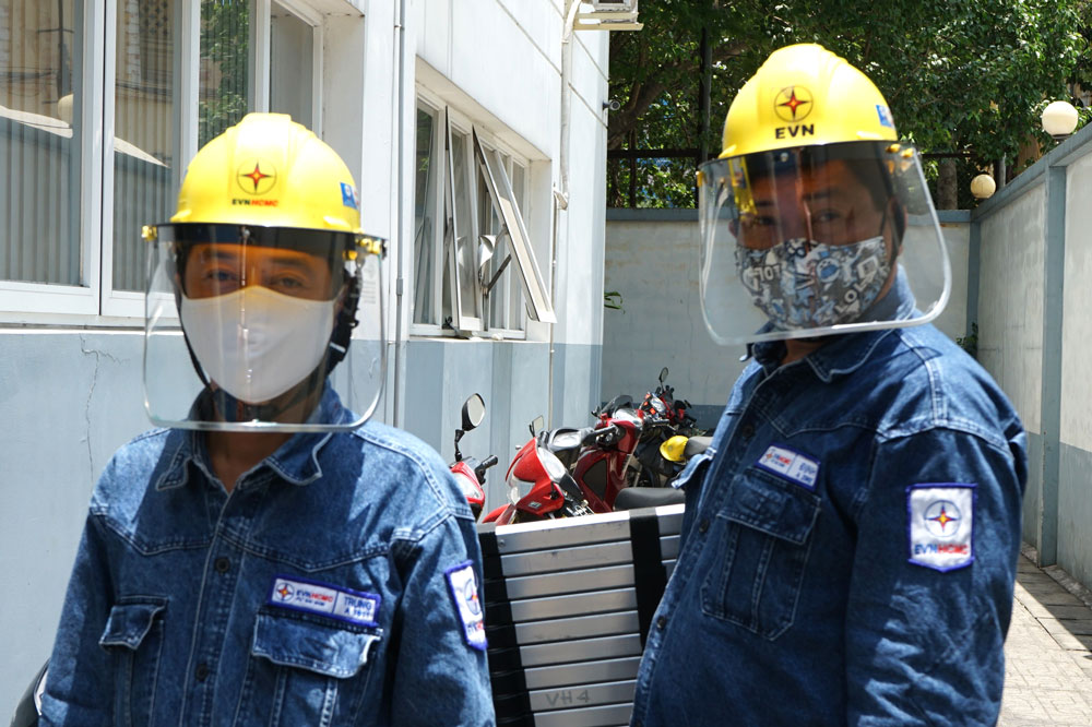 Một số đơn vị trực thuộc EVNHCMC đã gắn thêm tấm nhựa gắn vào mũ bảo hộ để chống giọt bắn, phòng dịch COVID-19 - Ảnh: ĐVCC