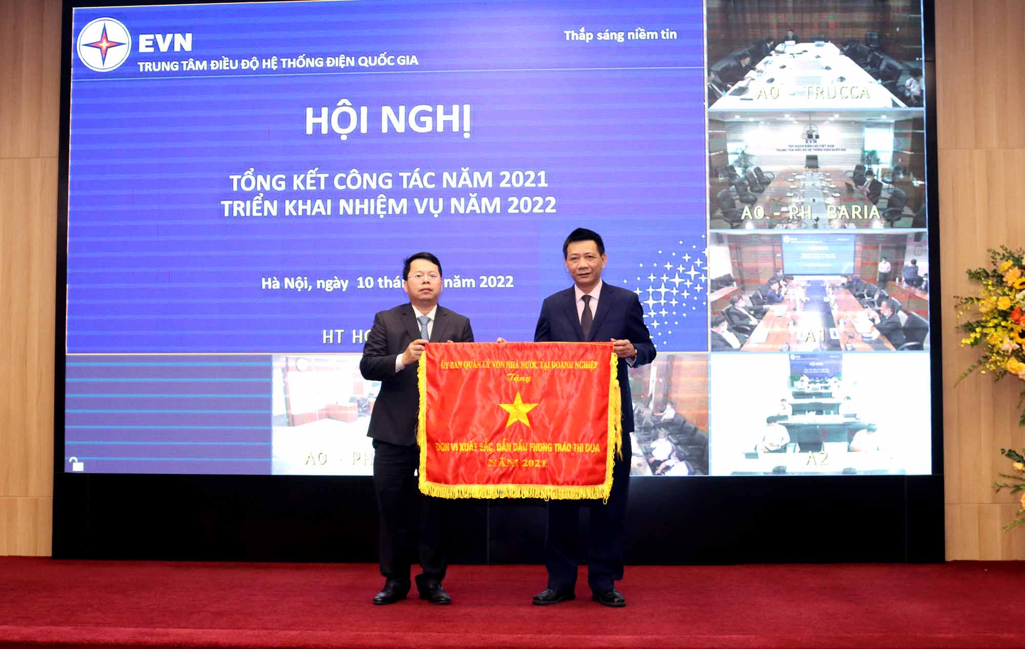 Tổng giám đốc EVN Trần Đình Nhân trao Cờ Thi đua của EVN cho các tập thể đạt thành tích xuất sắc của EVNNLDC trong năm 2021