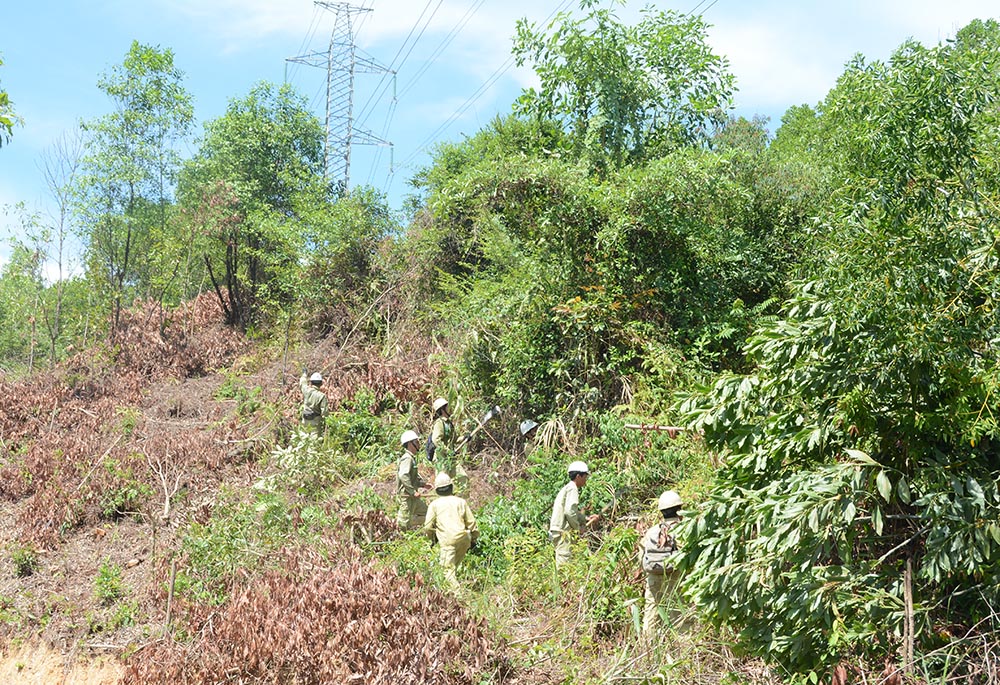 Công nhân Công ty Truyền tải điện 2 thu dọn thực bì dưới hành lang tuyến đề phòng cháy rừng ảnh hưởng đến hệ thống điện