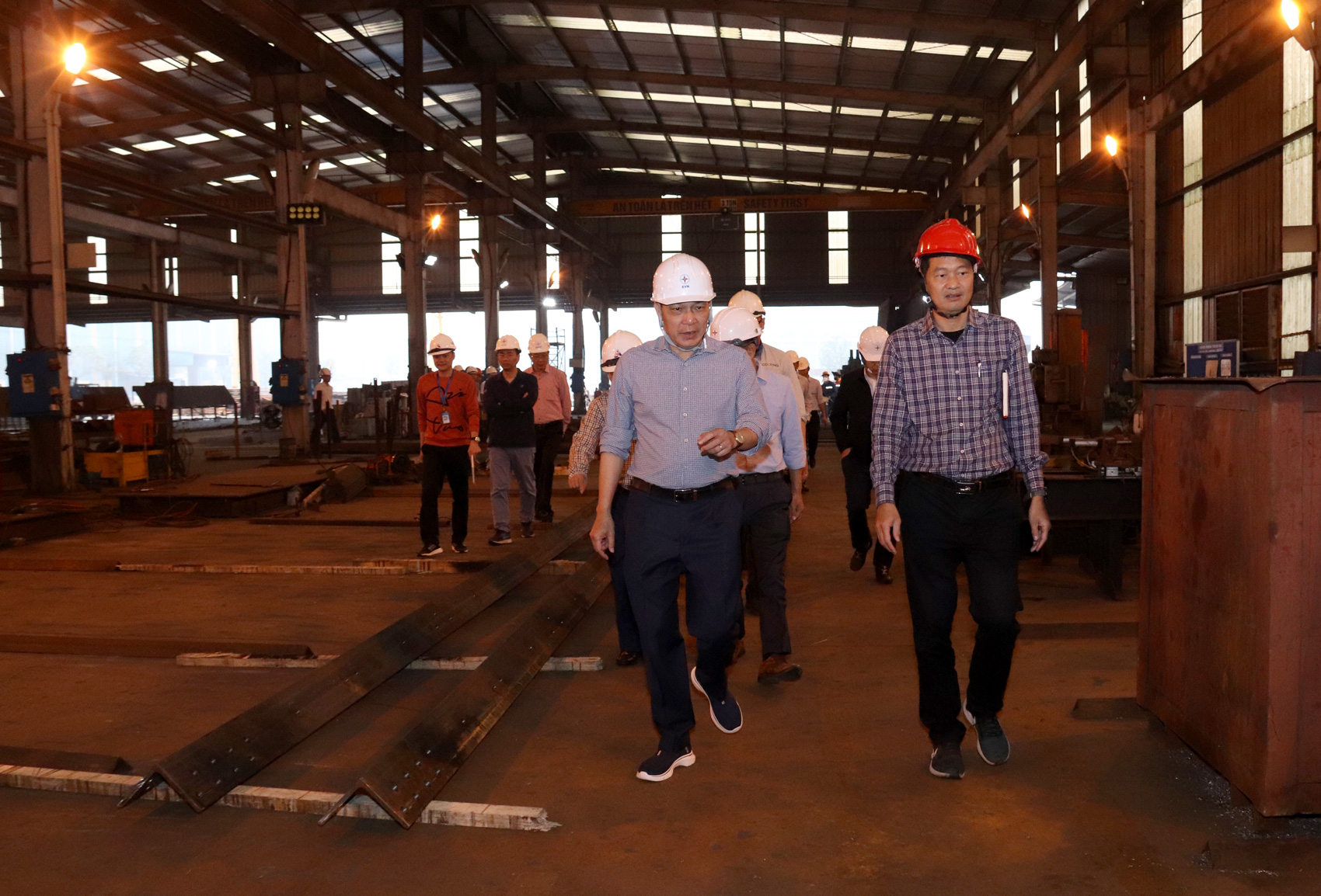 Chủ tịch HĐTV EVN Đặng Hoàng An (ngoài cùng bên trái) cùng đoàn công tác kiểm tra công tác sản xuất cột thép tại Nhà máy sản xuất Việt Vương ở Hưng Yên