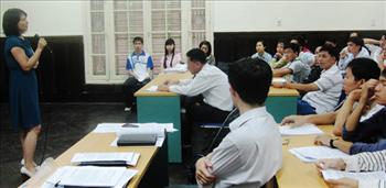Bà Phan Thị Hồng Hạnh, Phó Ban Tổ chức và Nhân sự EVN, hướng dẫn các thủ tục cam kết làm việc cho EVN cho các em sinh viên đi đào tạo điện hạt nhân tại Nga