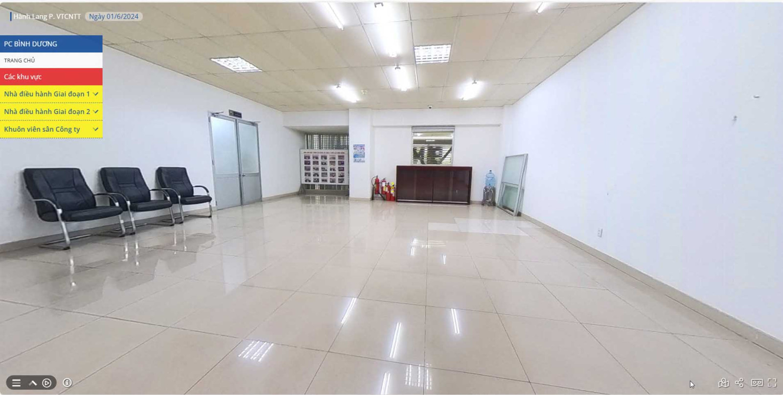 Giao diện hiển thị hình ảnh 3D của Nhà điều hành PCBD trên Web VR, phân loại theo khu vực để chọn di chuyển đến, hiển thị thông tin khi tương tác với thiết bị PCCC trên hình ảnh.