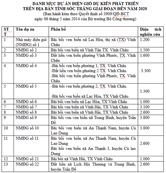 Theo Quy hoạch phát triển điện gió tỉnh Sóc Trăng giai đoạn đến năm 2020, tầm nhìn đến năm 2030 (Quyết định số 3909/QĐ-BCT ngày 6/5/2014 của Bộ Công Thương), tỉnh Sóc Trăng sẽ có 3 vùng quy hoạch phát triển điện gió, với khoảng 13 dự án.